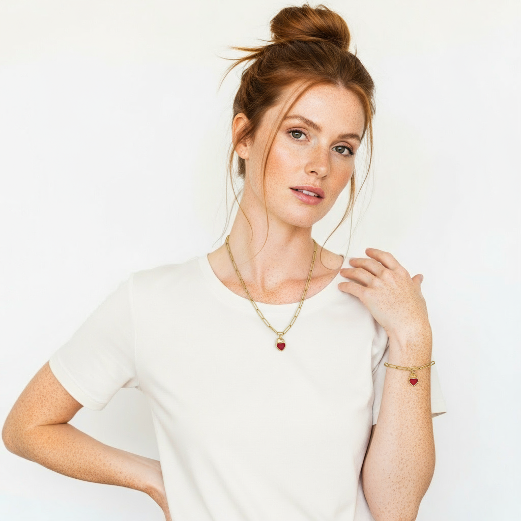 bracciale con catena dorata regolabile con ciondolo a forma di cuore con smalto rosso.