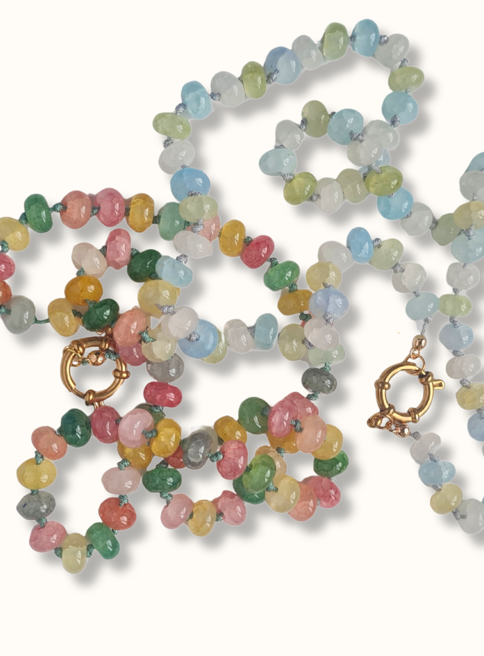 collana con perle in agata con pietre piatte sui toni del rossa o celeste, chiusura con moschettone rotondo. Lunghezza 50cm circa.