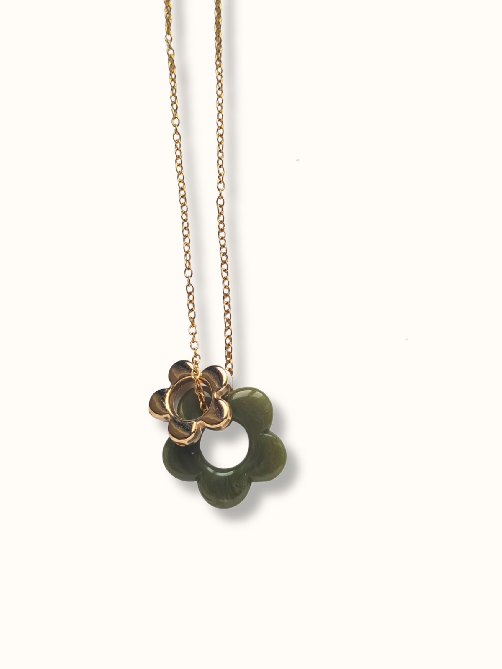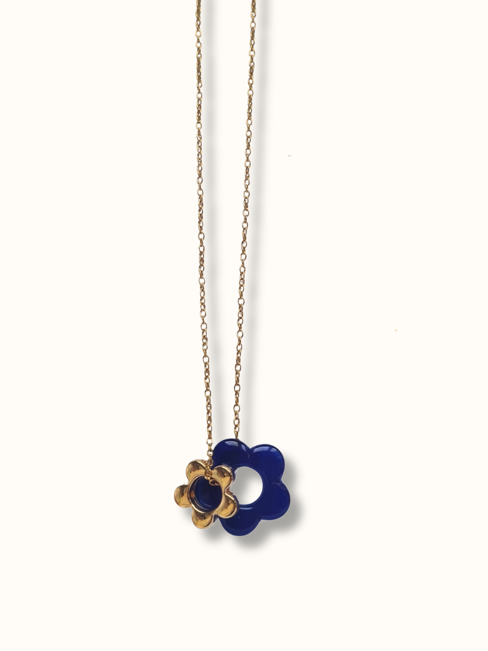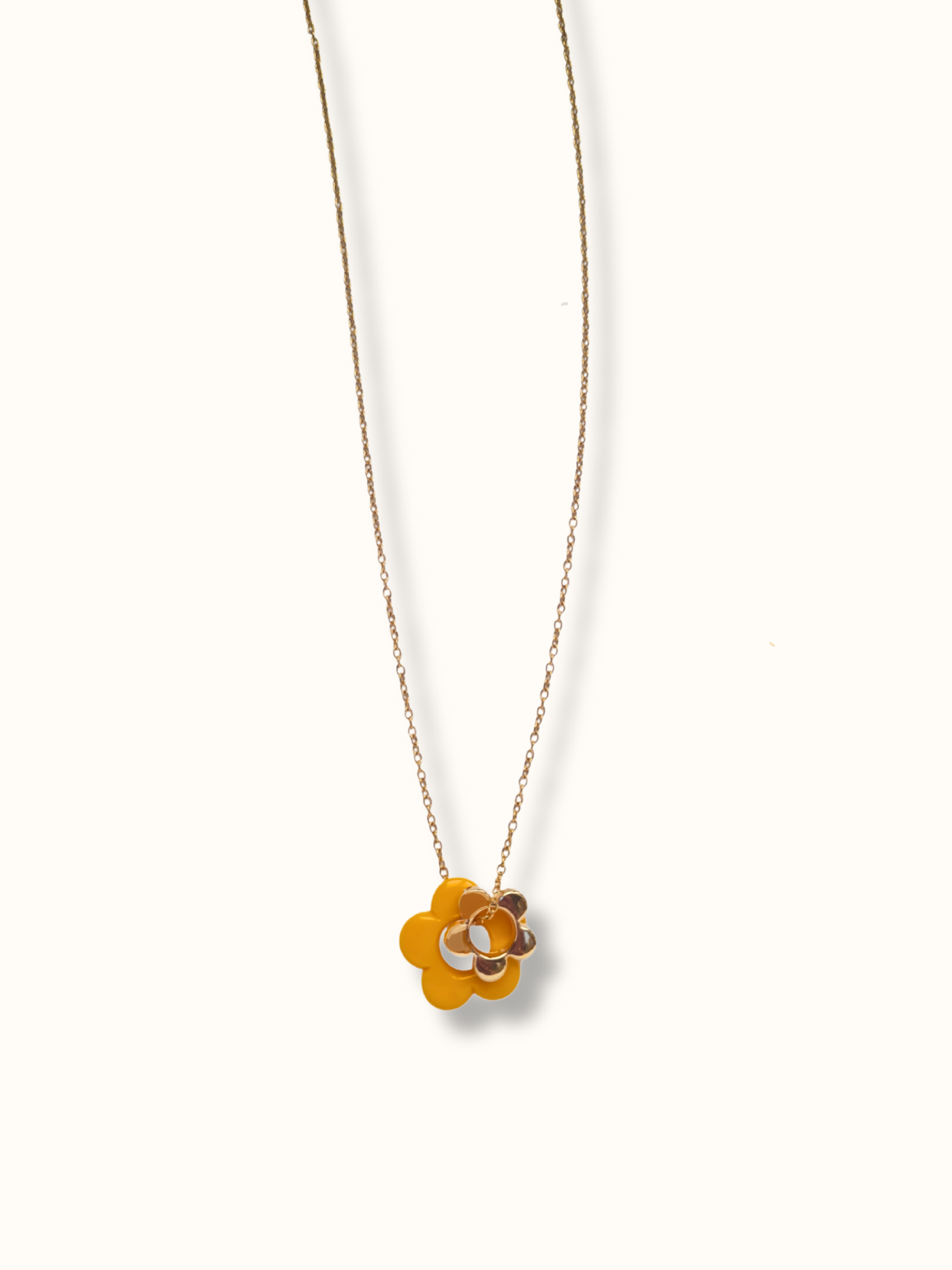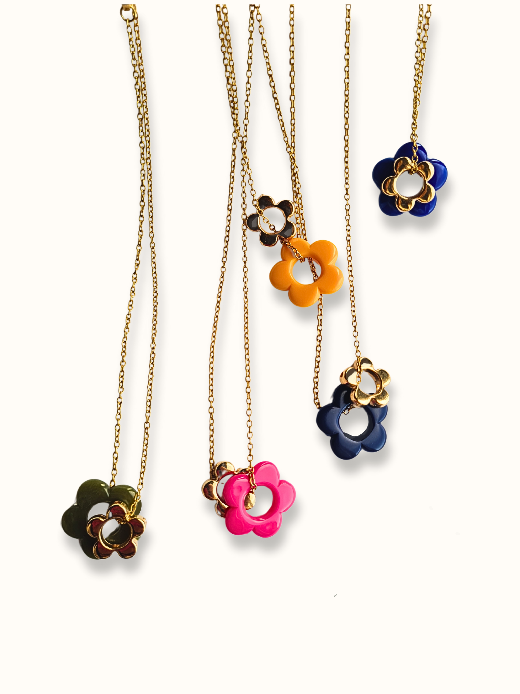 Collana in acciaio lunga 50cm, bagnata oro. Ogni collana ha due ciondoli un fiore grande il plexi colorato e un fiore piccolino in plexi oro.