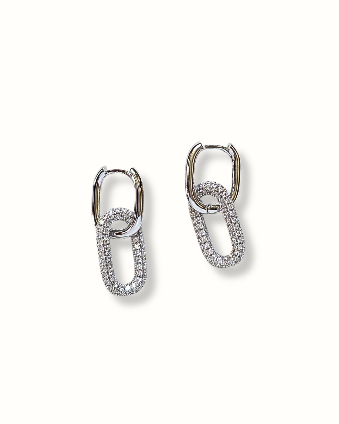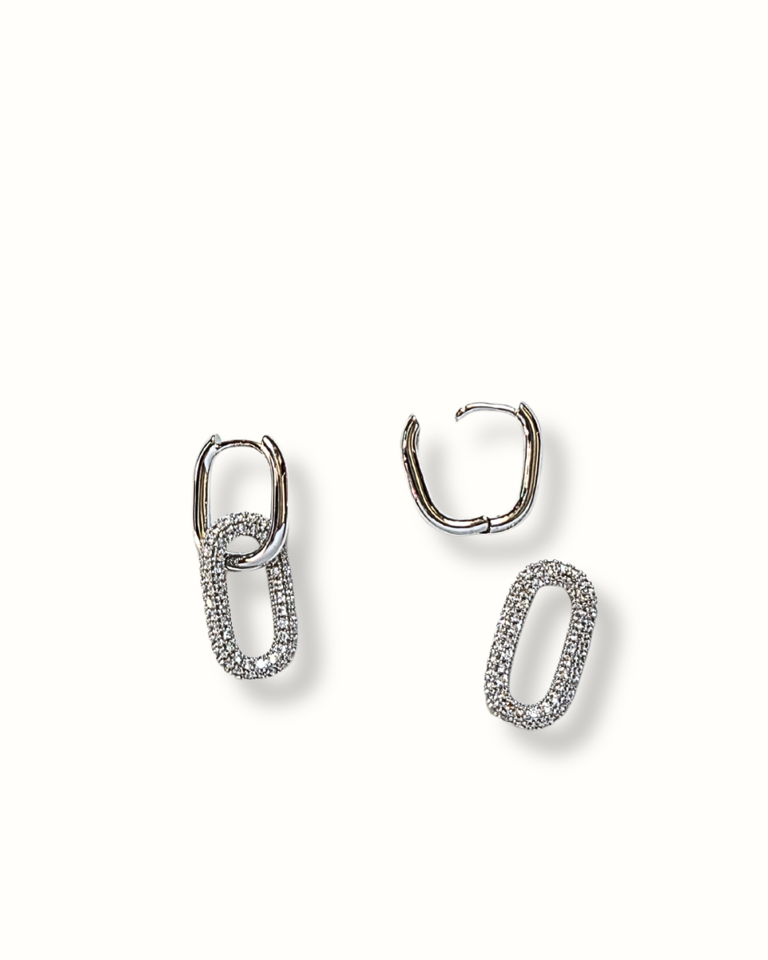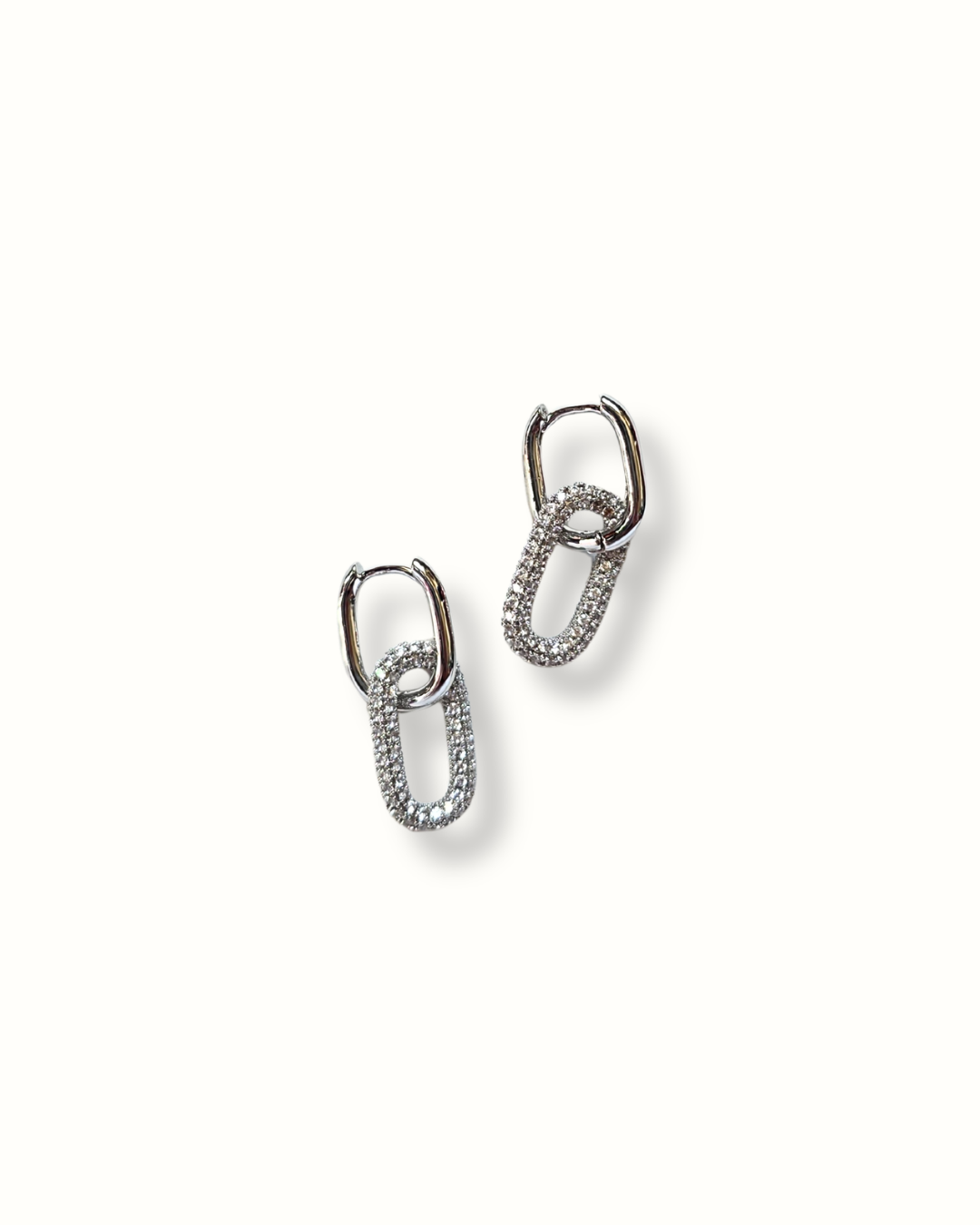 Orecchini a perno argento di forma rettangolare con ciondolo ovale con zirconi.