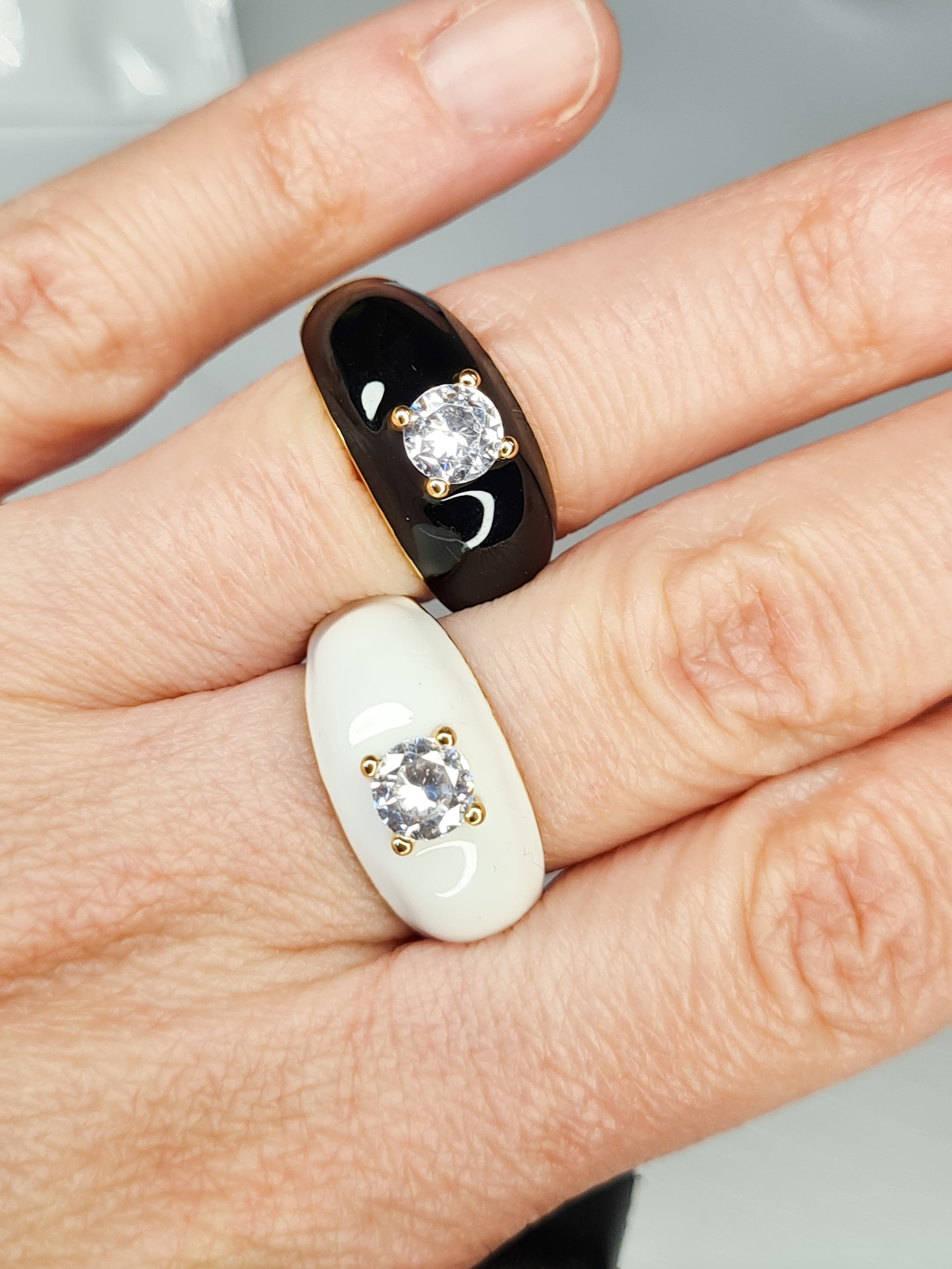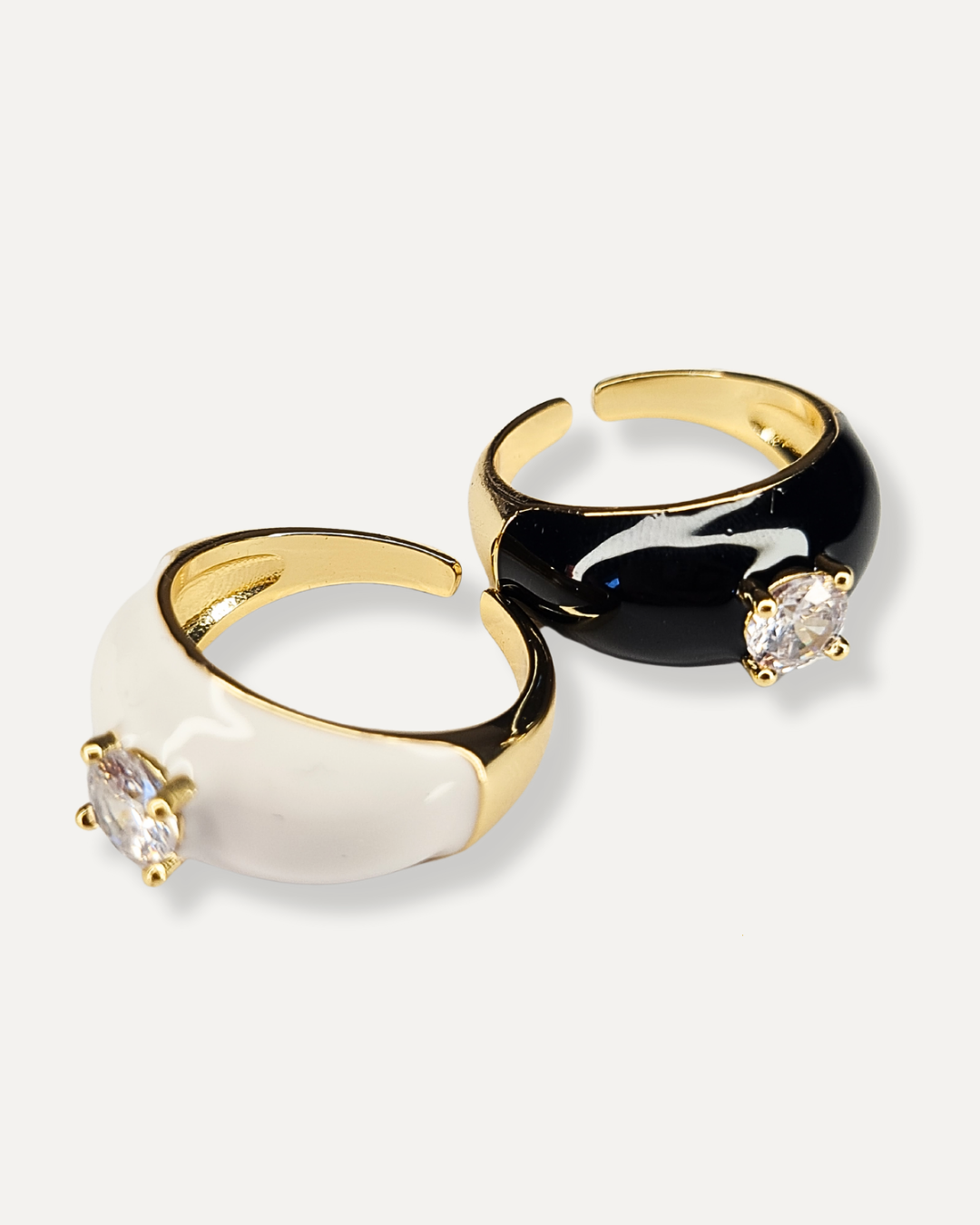 Anello regolabile dorato a forma bombata, smalto nero o bianco e solitario centrale.